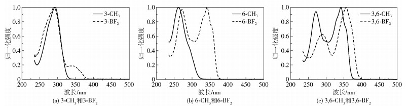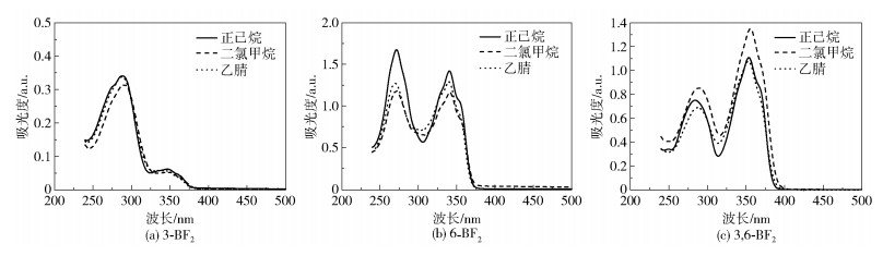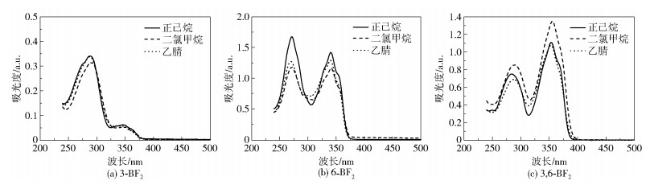 图 6 3种二氟硼化合物在不同极性溶剂中的紫外-可见吸收光谱Fig. 6 UV-Vis absorption spectra of three difluoroboron compounds in organic solvents with different polarities |