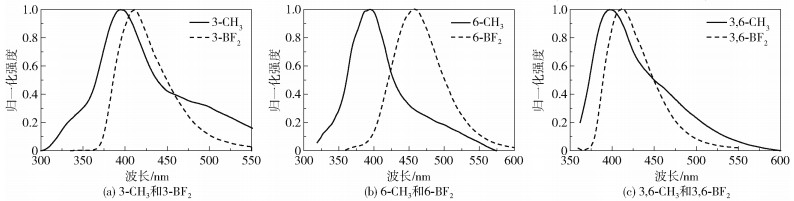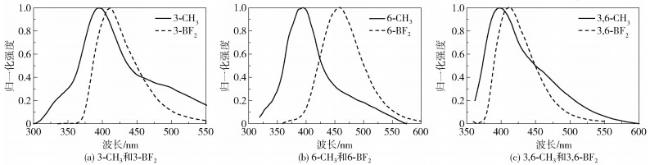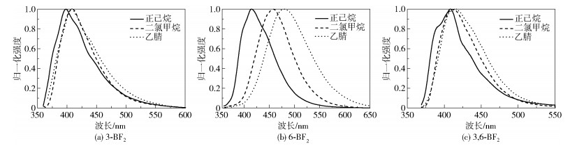 图 7 3种二氟硼化合物在不同极性溶剂中的荧光发射光谱(λex=350 nm)Fig. 7 Fluorescence emission spectra of three difluoroboron compounds in organic solvents with different polarities (λex=350 nm) |