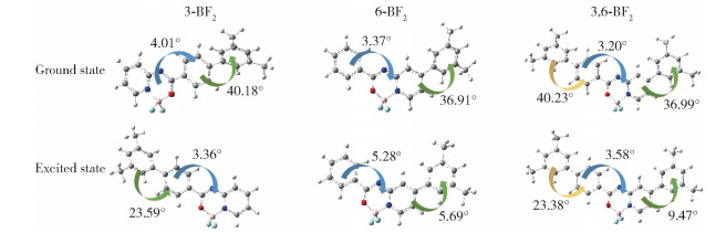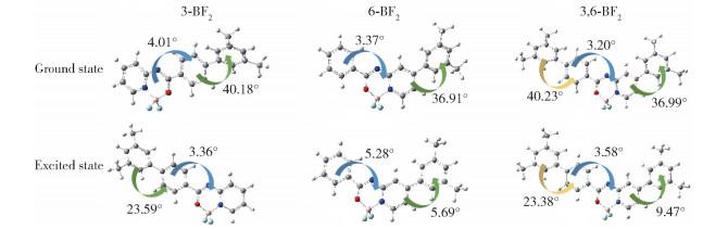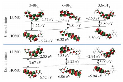图 8 基于分子模拟的3种二氟硼化合物在基态和激发态时的HOMO与LUMO能级的电子密度分布Fig. 8 Electron density distribution of the HOMO and LUMO energy levels in the ground and excited states of three difluoroboron compounds based on molecular simulation |