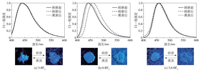 图 11 3种二氟硼化合物在不同处理方式下的荧光发射光谱(λex=365 nm)Fig. 11 Fluorescence emission spectra of three difluoroboron compounds under different treatment methods (λex=365 nm) |