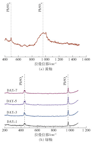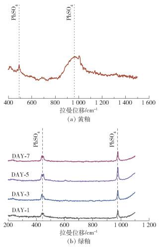 图 6 酸性溶液(pH=1)中黄釉和绿釉琉璃瓦釉面腐蚀产物的拉曼光谱Fig. 6 Raman spectra of the corrosion products on the glaze surface of the yellow and green glazed tiles in acidic solution (pH=1) |