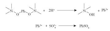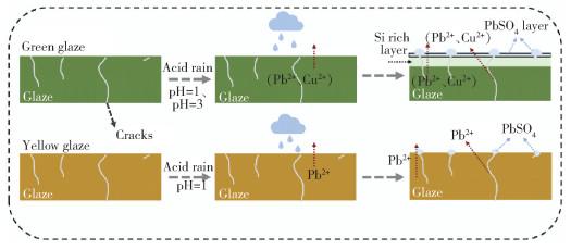 图 11 釉层铅流失及腐蚀产物硫酸铅生成反应Fig. 11 Lead loss in the glaze layer and formation reaction of the corrosion product lead sulfate |