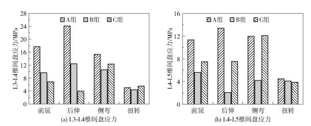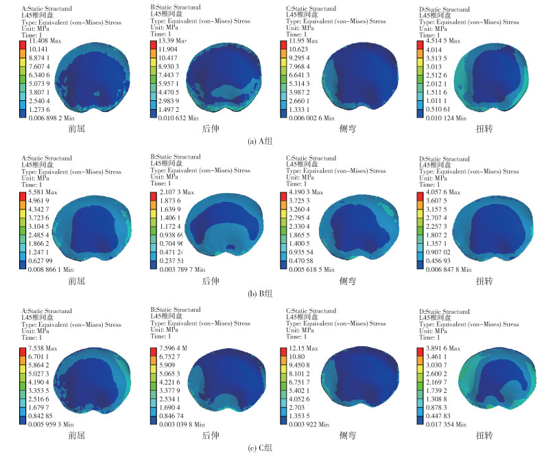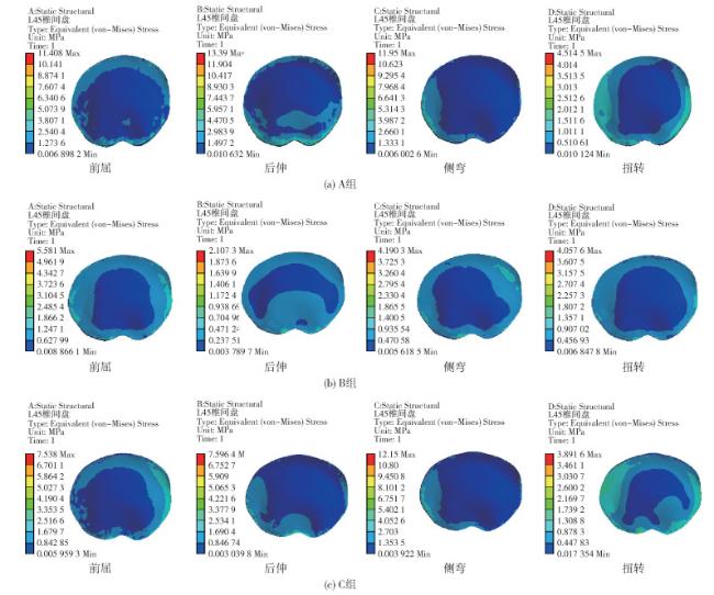 图 10 不同内固定方案中L4-L5椎间盘的应力分布云图Fig. 10 Stress distribution contours of the L4-L5 intervertebral disc for different internal fixation schemes |
