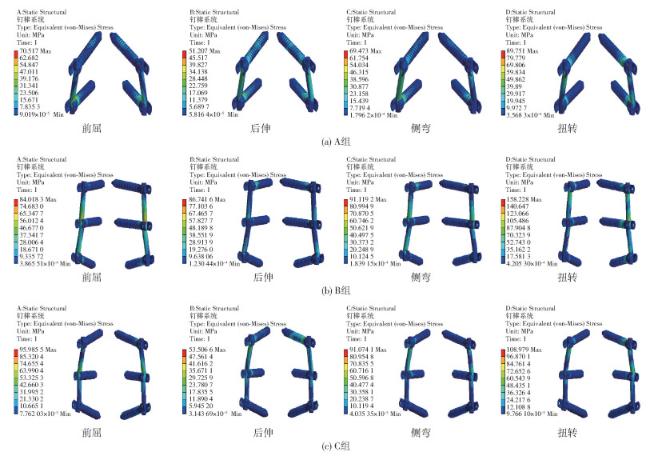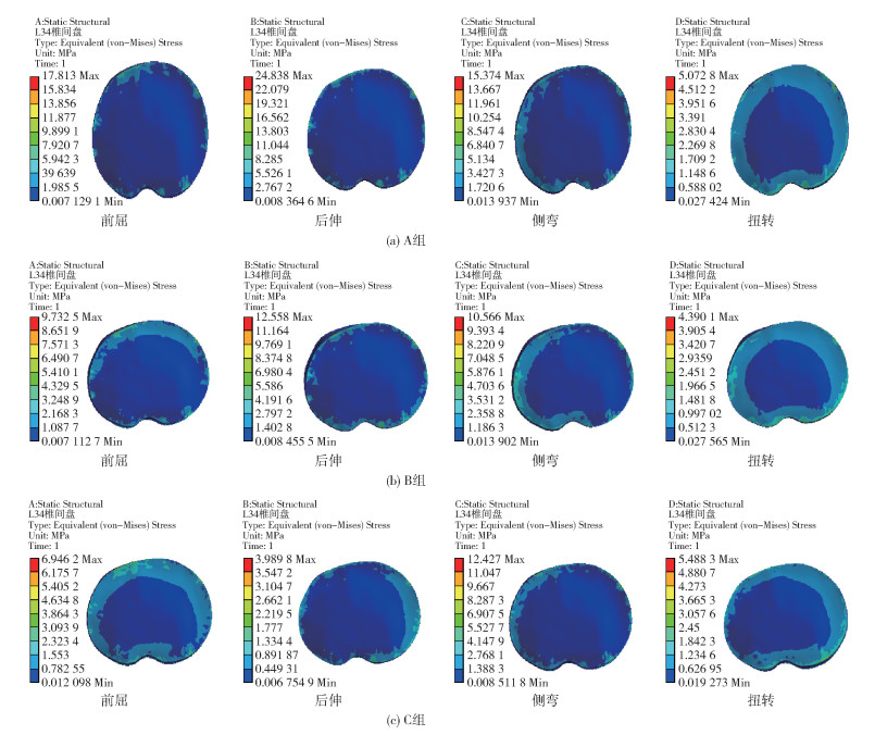 图 9 不同内固定方案中L3-L4椎间盘的应力分布云图Fig. 9 Stress distribution contours of the L3-L4 intervertebral disc for different internal fixation schemes |