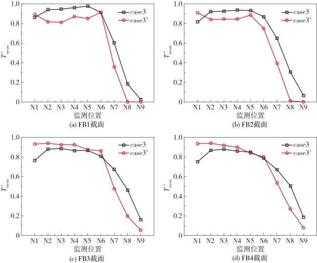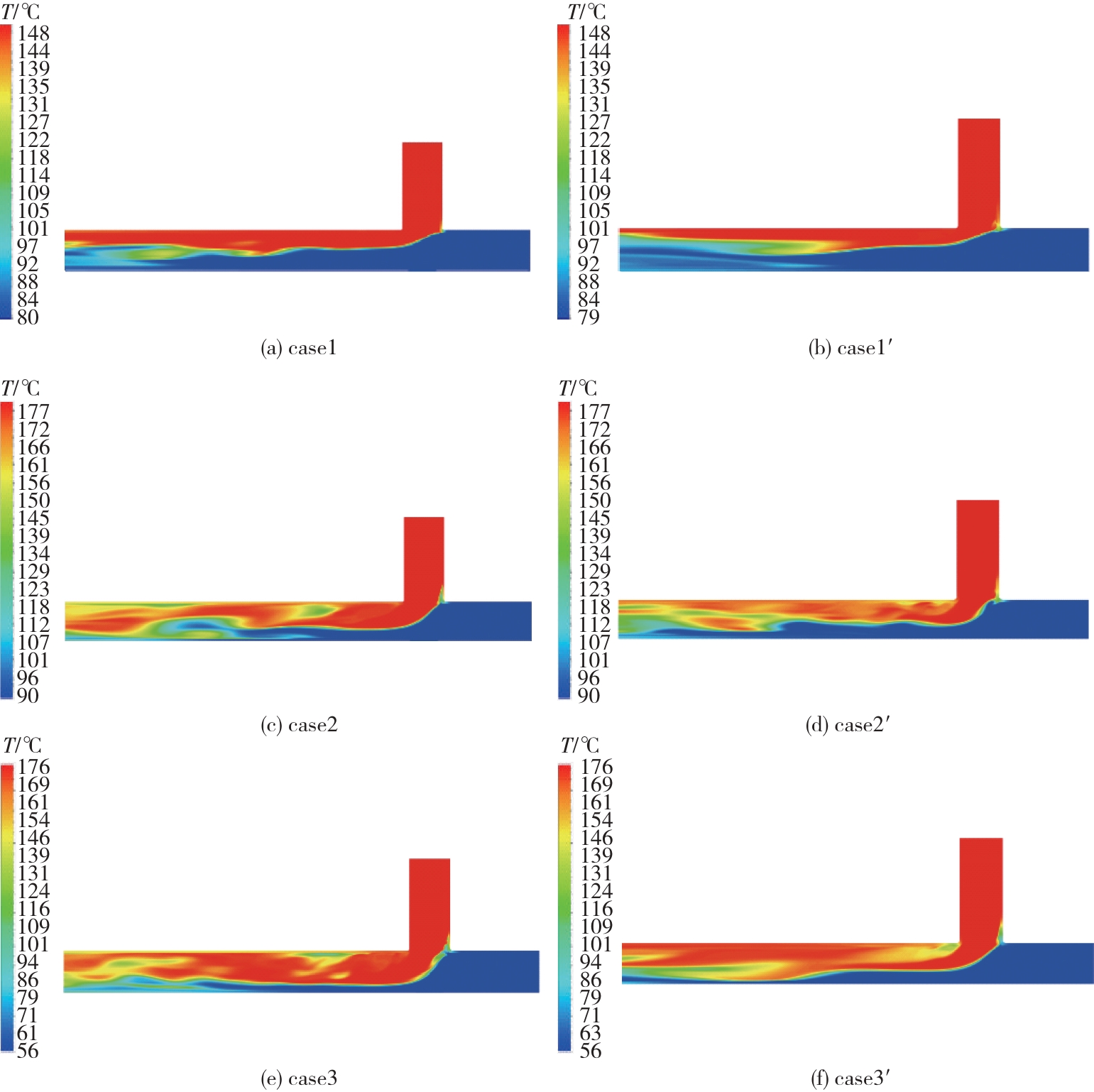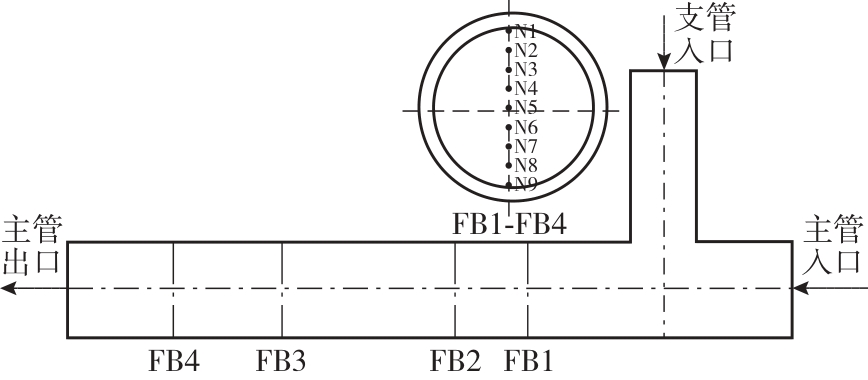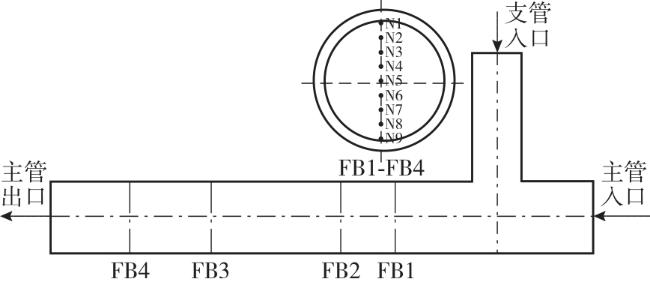 | 工况 | 主管温度/℃ | 支管温度/℃ | 主管流速/(m‧s-1) | 支管流速/(m‧s-1) | 动量比 | 流型 |