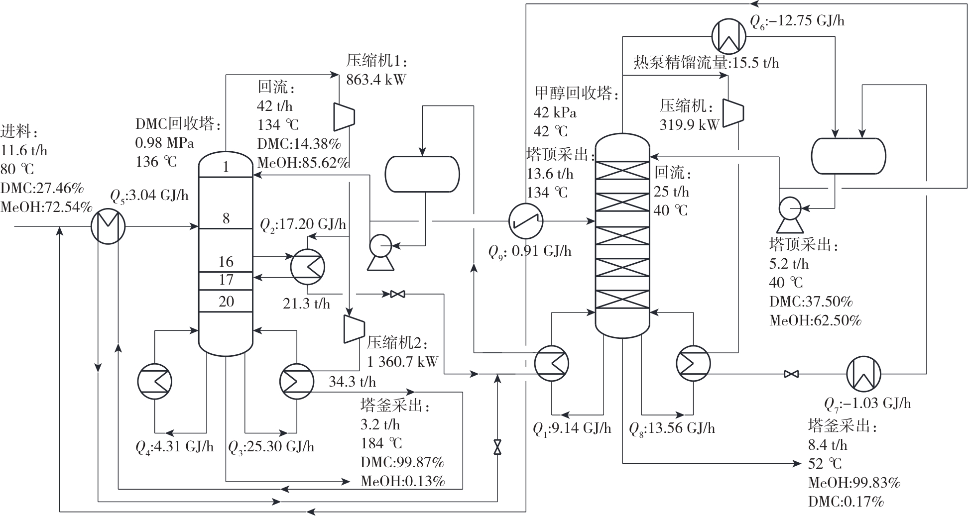 | 常规热泵精馏 | 一级压缩+中间再沸器 | 二级压缩+中间再沸器 | |
