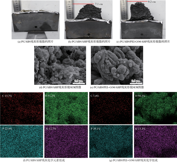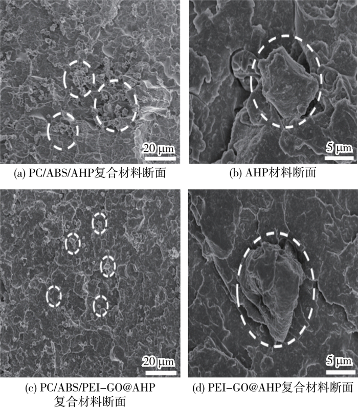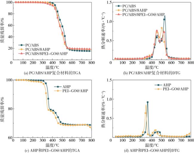 图 4 PC/ABS合金、AHP和PEI-GO@AHP在氮气氛围下的热稳定性Fig. 4 The thermal stability in a N2 atmosphere of PC/ABS blends, AHP and PEI-GO@AHP |