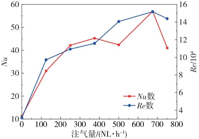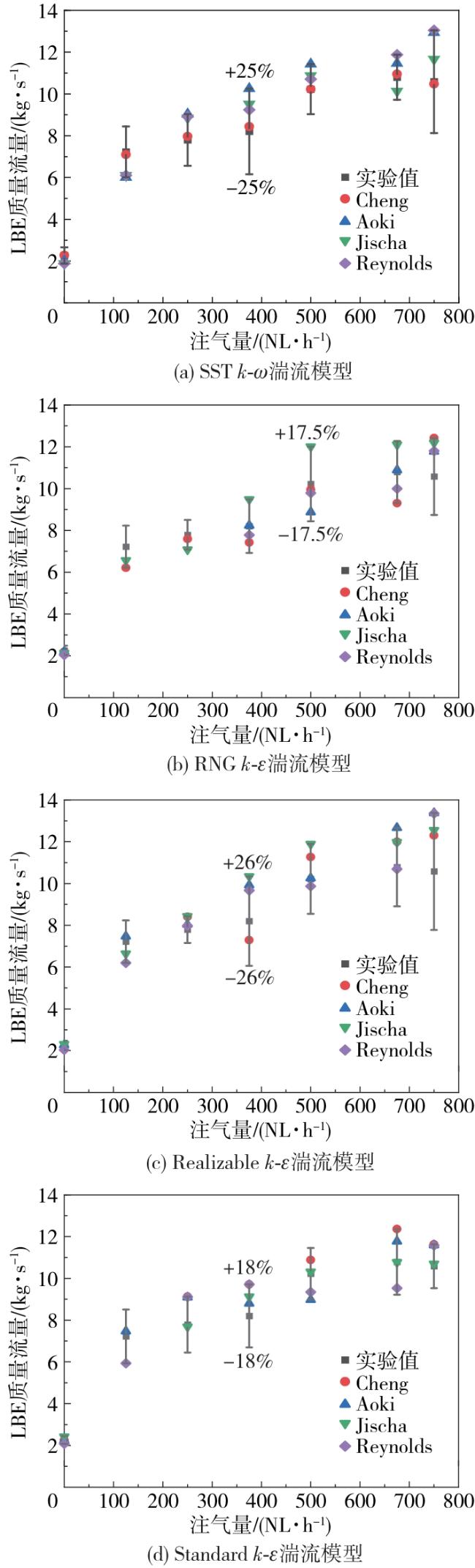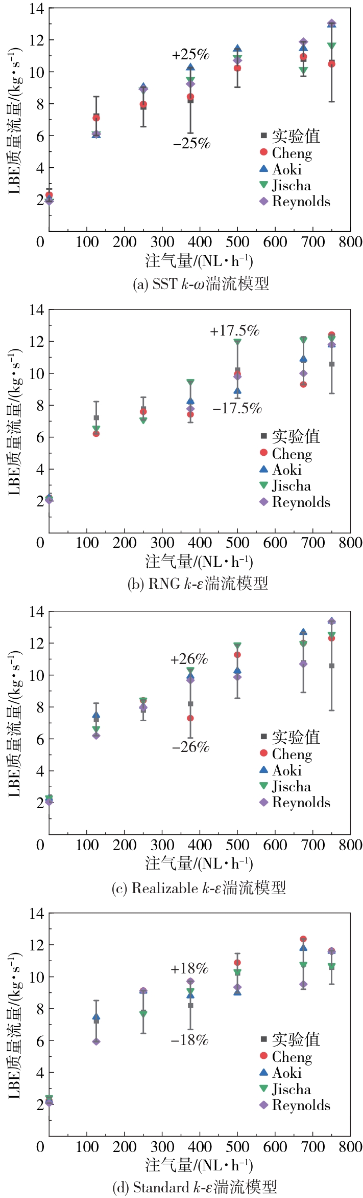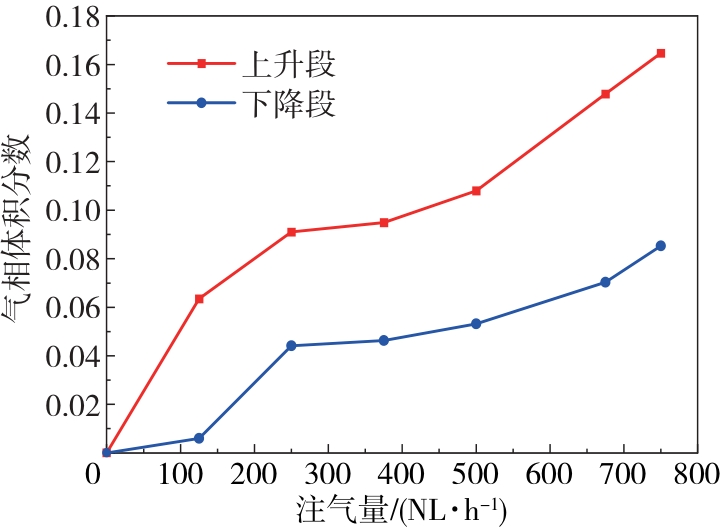 [5]进行了气举增强液态LBE自然循环实验,研究结果表明当注气量较低时,液态LBE质量流量随注气量的增加而迅速增加,当注气量较大时,液态LBE质量流量随注气量增加而增速变缓。Yamada等