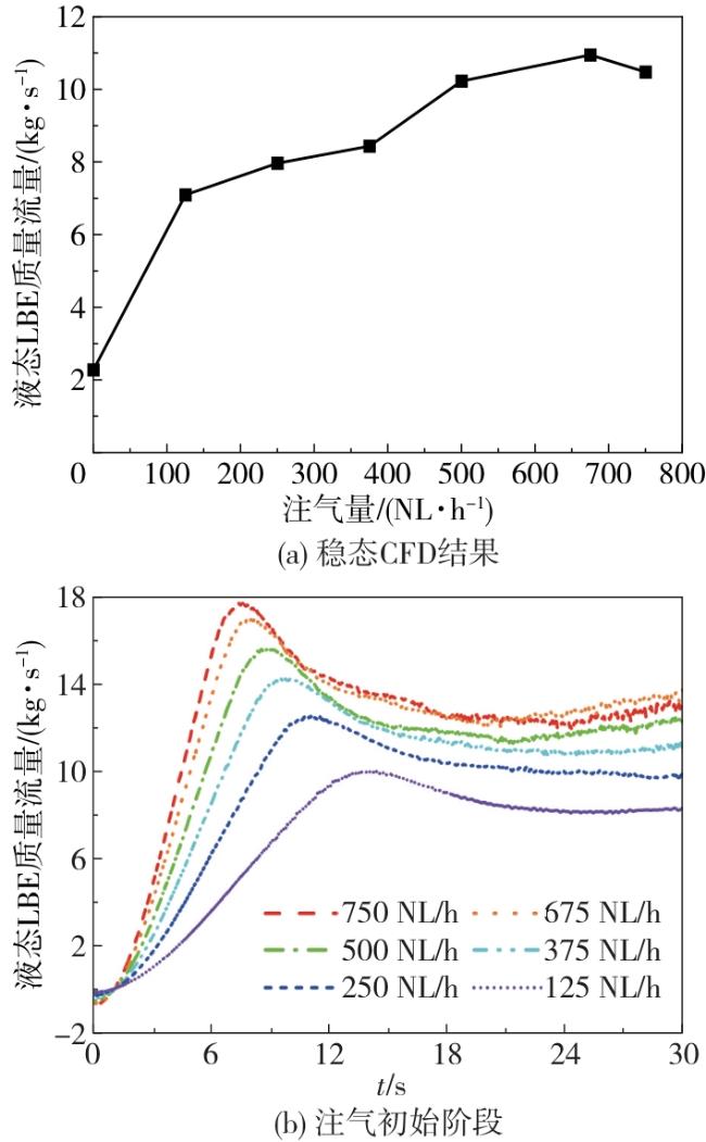 [4],结果表明在气举驱动循环模式下,液态LBE质量流量随注气速率的增大而增大。Shi等